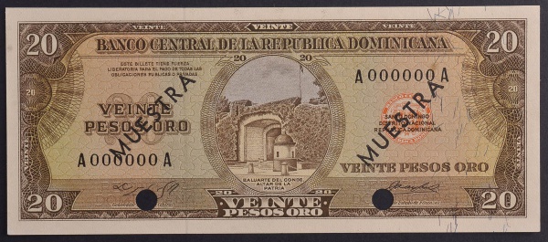 • Cédula Estrangeira, "MUESTRA", REPÚBLICA DOMINICANA, Valor 20 Pesos Oro, Data 1964/1974, Flor de Estampa.
