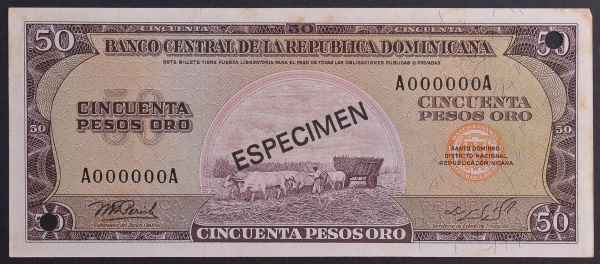 • Cédula Estrangeira, "SPECIMEN", REPÚBLICA DOMINICANA, Valor 50 Pesos Oro, Data 1964/1974, com Manchas - Flor de Estampa.