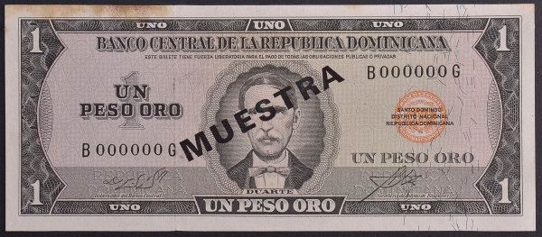 • Cédula Estrangeira, "MUESTRA", REPÚBLICA DOMINICANA, Valor 1 Peso Oro, Data 1973/1975, com Mancha - Flor de Estampa.