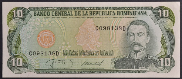 • Cédula Estrangeira, REPÚBLICA DOMINICANA, Valor 10 Pesos Oro, Data 1987, Flor de Estampa.