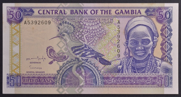 • Cédula Estrangeira, GAMBIA, Valor 50 Dalasis, Data 1996, Assinatura 12 - Catálogo Internacional, Flor de Estampa.