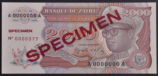 • Cédula Estrangeira, "SPECIMEN", ZAIRE, Valor 2000 Zaires, Data 01/10/1991, Flor de Estampa.