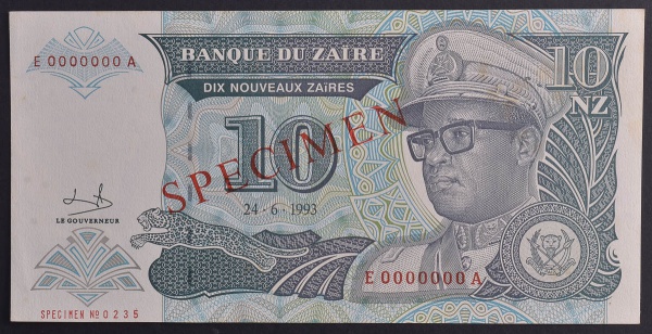 • Cédula Estrangeira, "SPECIMEN", ZAIRE, Valor 10 Novos Zaires, Data 24/06/1993, com Manchas - Flor de Estampa.