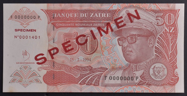 • Cédula Estrangeira, "SPECIMEN", ZAIRE, Valor 50 Novos Zaires, Data 15/02/1994, com Mancha - Flor de Estampa.