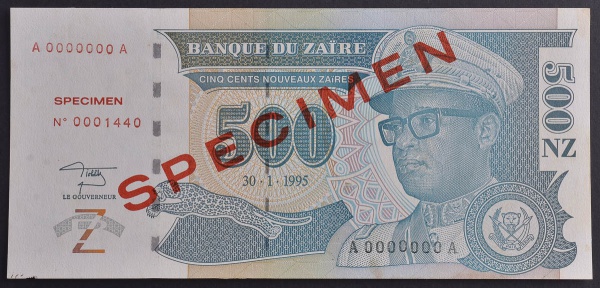 • Cédula Estrangeira, "SPECIMEN", ZAIRE, Valor 500 Novos Zaires, Data 30/01/1995, Flor de Estampa.