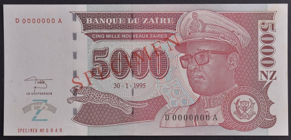 • Cédula Estrangeira, "SPECIMEN", ZAIRE, Valor 5000 Novos Zaires, Data 30/01/1995, Flor de Estampa.