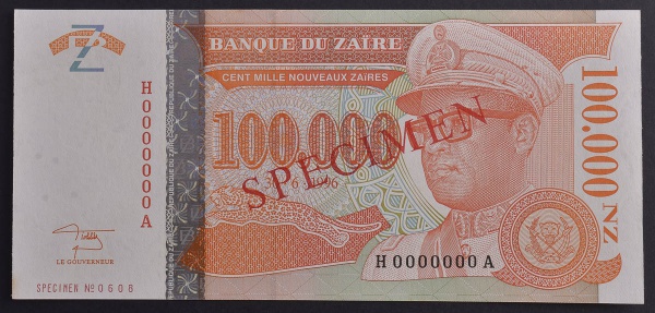 • Cédula Estrangeira, "SPECIMEN", ZAIRE, Valor 100.000 Novos Zaires, Data 30/06/1996, Flor de Estampa.