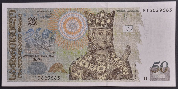 • Rara Cédula Estrangeira, GEORGIA, Valor 50 Lari, Data 2008, Flor de Estampa.