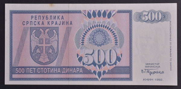 • Cédula Estrangeira, SERVIA ocupação na KRAJINA, Valor 500 Dinar, Data 1992, Flor de Estampa.