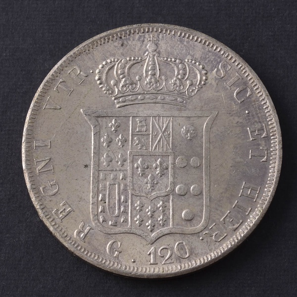 • Moeda Estrangeira, "RÉPLICA", NAPOLI - ITÁLIA, 120 Grana, Ano 1854, Prata Baixa, Peso 22,7 g, Flor de Cunho.