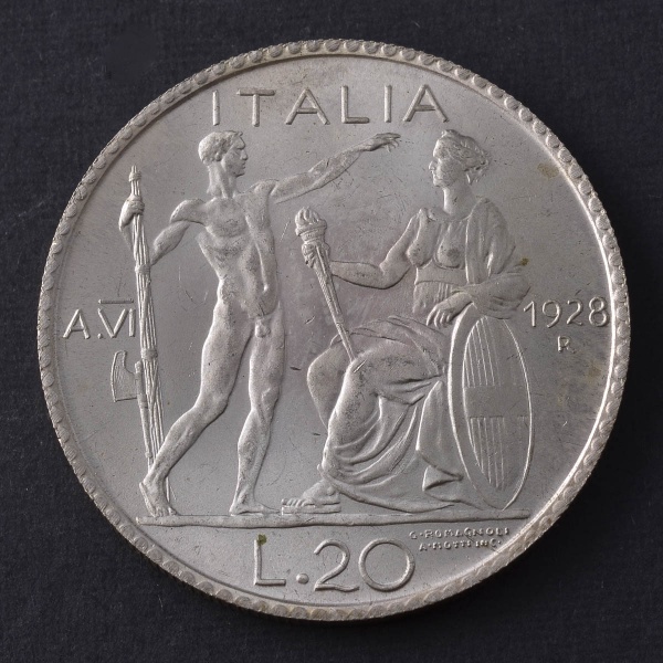 • Moeda Estrangeira, "RÉPLICA", ITÁLIA, Valor 20 Liras, Ano 1928 R, Prata Baixa, Peso 20,3 g, Flor de Cunho.