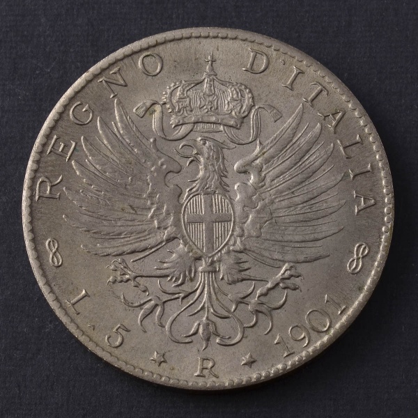 • Moeda Estrangeira, "RÉPLICA", ITÁLIA, Valor 5 Liras, Ano 1901, Prata Baixa, Peso 22,7 g, Flor de Cunho.