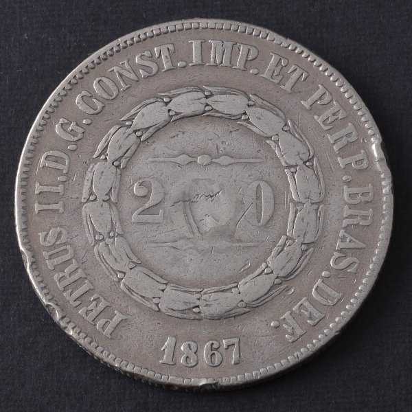 • Moeda Brasileira, Império, 3º Sistema Monetário, 2º Tipo, Valor 2000 Reis, Ano 1867, Prata, Tentativa de Furo, Bem Circulada.