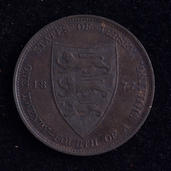 • Moeda Estrangeira,  JERSEY, Valor 1/24 Shilling, Ano 1877, Bronze, Soberba/Flor de Cunho.