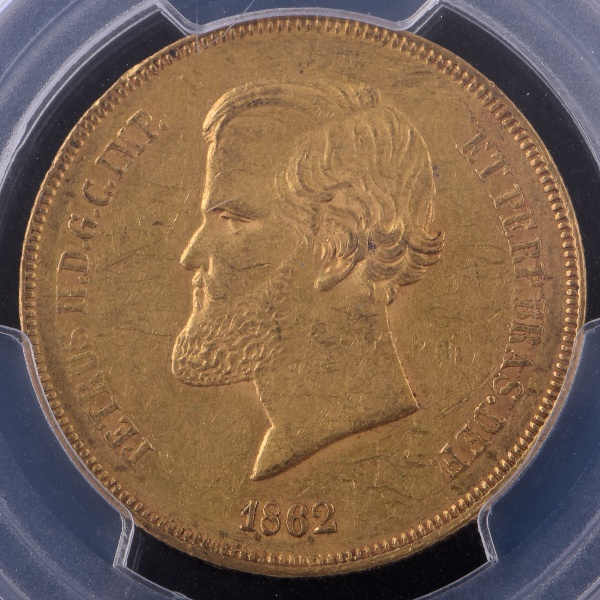 • Numismática: Raríssima Moeda do Brasil, Império - D.Pedro II, Valor 20.000 Reis, Ano 1862 ( Considerada a Moeda mais Rara do Império), Ouro, Peso 17,93 g, Diâmetro 30 mm, Certificada e Classificada (AU55 ) pela Conceituada Empresa Americana PCGS, Estado de Conservação Soberba.