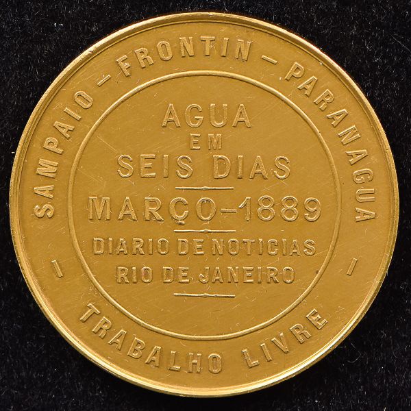 • Numismática: Raríssima Medalha do Império, " Água em Seis Dias " - Evento Histórico Combateu a Falta de Água no Rio de Janeiro/ Data  Março de 1889 - Pertenceu a Paulo de Frontin - Engenheiro Responsável pelo Abastecimento, Ouro 22k, Peso 60 g, Diâmetro 45 mm, Muito Bem Conservada, Apenas 1 Medalha Conhecida - Alta Cotação, Excelente Oportunidade..