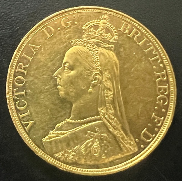 • Moeda Estrangeira, INGLATERRA, Rainha Vitória, Valor 5 Libras,  Ano 1887, Ouro, Peso 40 g, Soberba.
