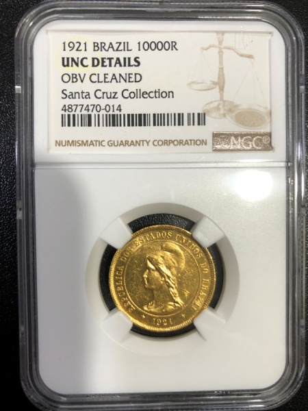 • Moeda do Brasil, República, Valor 10.000 Reis, Ano 1921, Metal Ouro, Peso 8,86 g, Diâmetro 23 mm, Certificada, Ótima Oportunidade, Coleção Particular, Detalhes de não Circulada - Soberba.