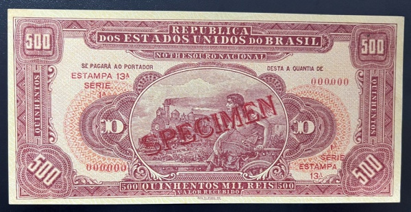 • Raríssima Cédula Brasileira, República, Valor 500 Mil Reis, Emissão 1924, 13ª Estampa, Specimen, Flor de Estampa.