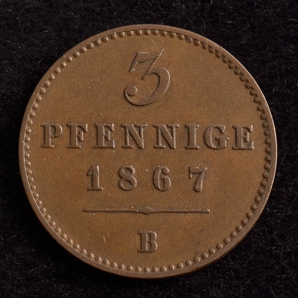 • Moeda Estrangeira, WALDECK - PYRMONT - Estado Alemão, Valor 3 Pfennig, Ano 1867 B, Bronze, Soberba/Flor de Cunho..