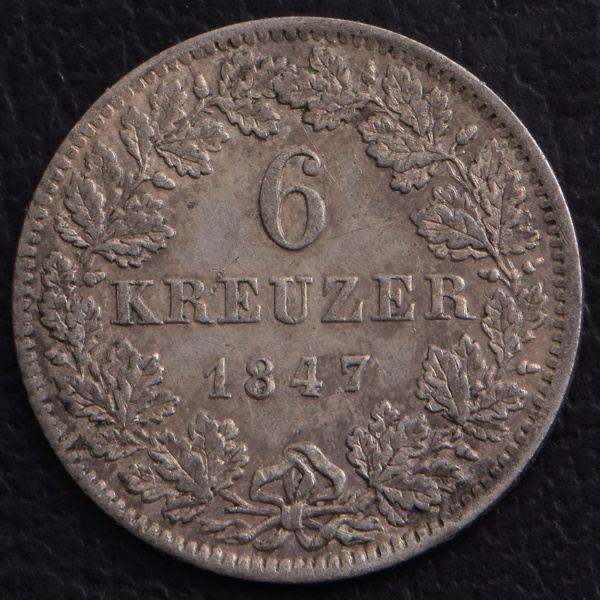 • Moeda Estrangeira, Estado Alemão / HESSE - DARMSTADT, Valor 6 Kreuzer, Ano 1847, Prata, Alta Cotação nos Catálogos Internacionais, Difícil Encontrar neste Estado de Conservação - Flor de Cunho.