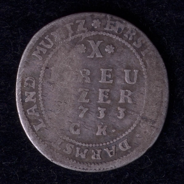 • Moeda Estrangeira, ALEMANHA - Condado de HESSE - DARMESTÁDIO , Valor 10 Kreutzer, Ano 1733, Muito Bem Conservada.