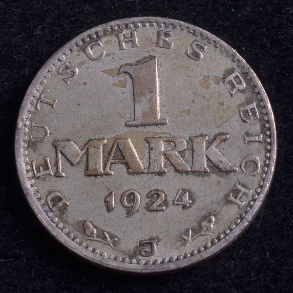 • Moeda Estrangeira, ALEMANHA - República de WEIMAR , Valor 1 Mark, Ano 1924 J, Prata, Soberba.