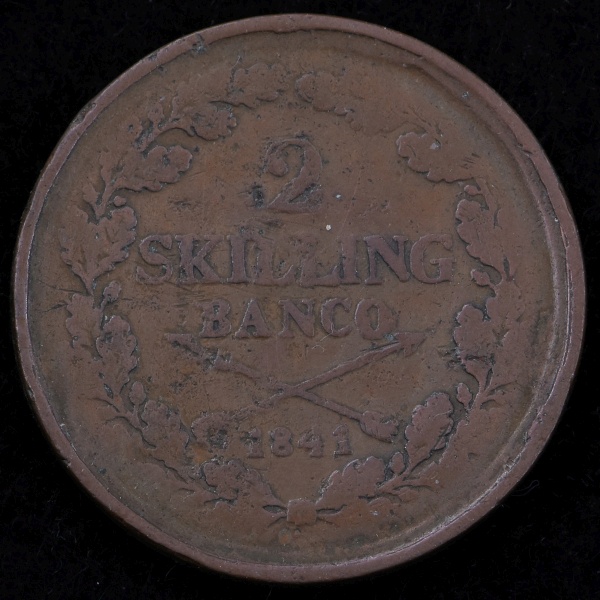 • Rara Moeda Estrangeira, SUÉCIA, Valor 2 Skilling, Ano 1841, Cobre, MBC.