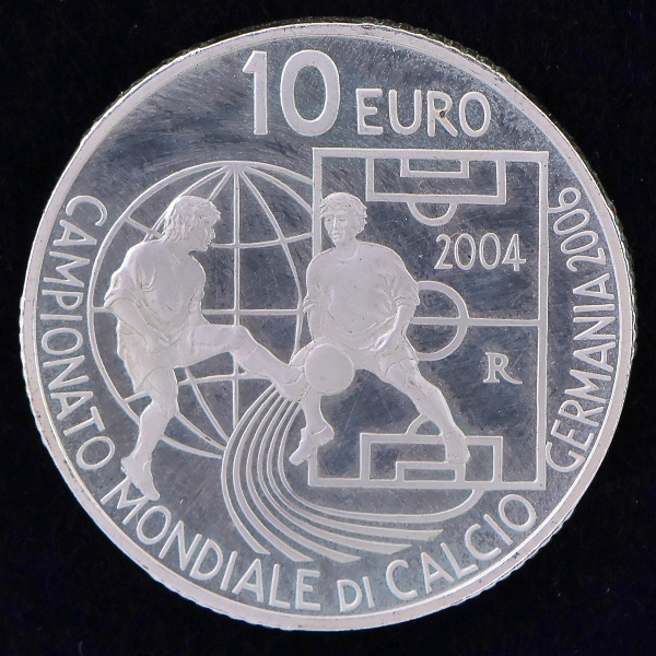 • Rara Moeda Estrangeira Comemorativa, SAN MARINO, Itália Campeã da Copa do Mundo da Alemanha 2006, Valor 10 EUROS, Ano 2004, Prata, Peso 21,6 g, Diâmetro 34 mm, Flor de Cunho.