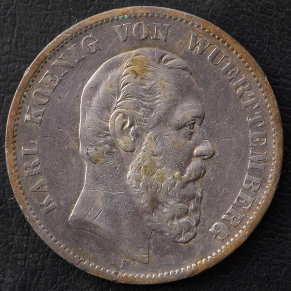 • Moeda Estrangeira, ALEMANHA - WURTTEMBERG, Valor 5 Marcos, Data 1876 F, Prata, Peso 27,6 g, Diâmetro 38 mm, MBC/Soberba.