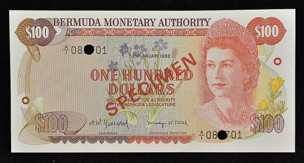 • Cédula de Bermuda, 100 Dollares, Ano 1982, SPECIMEN, Flor de Estampa.