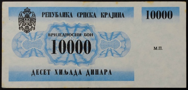 • Raríssima Cédula da SÉRBIA Ocupação na KRAJINA, Valor 10.000 Dinar, Data 1991, Flor de Estampa.