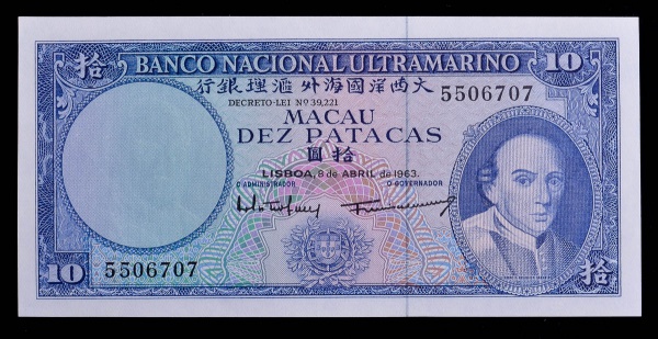 • Rara Cédula Estrangeira, MACAU, Valor 10 Patacas, Data 08/04/1963, Flor de Estampa.