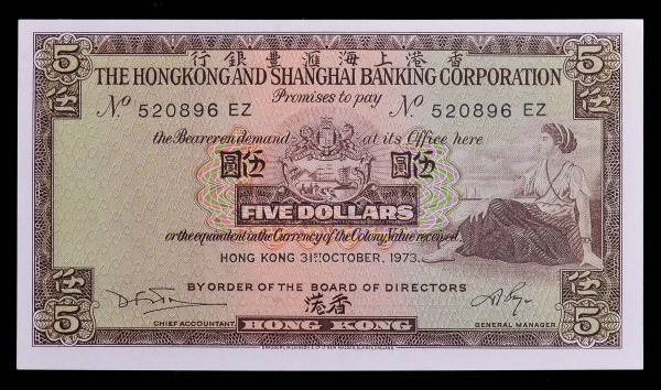 • Cédula Estrangeira, HONG KONG, Valor 5 Dollars, Data 31/10/1973, Flor de Estampa.