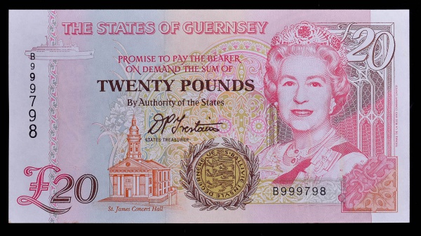 • Cédula Estrangeira, GUERNSEY,  Valor 20 Pounds, Data 1996, Flor de Estampa.