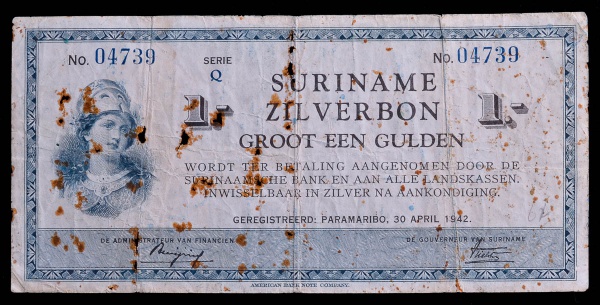 • Rara Cédula Estrangeira, SURINAME, Valor Gulden, Data 30/04/1942, Bem Conservada.