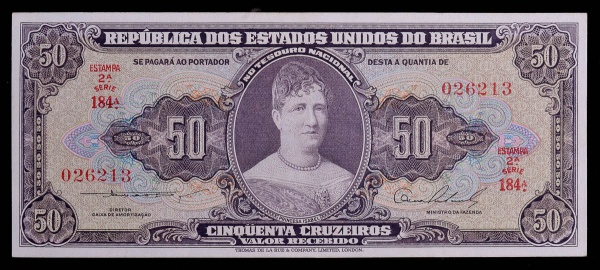 • Cédula Brasileira, Valor 50 Cruzeiros, Série 184ª - Assinaturas  Claudionor de Souza Lemos / Eugênio Gudin, 2ª Estampa, Período de Circulação 1949/1956, Soberba/Flor de Estampa.