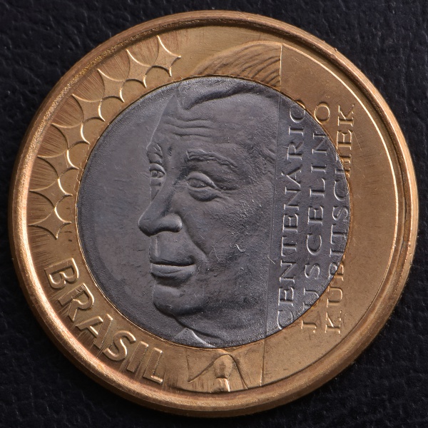 • Moeda do Brasil, Comemorativa ao Centenário de JK, Valor 1 Real, Data 2002, Cupro Níque e Alpaca, Linda Peça com Brilho de Cunhagem - Flor de Cunho.