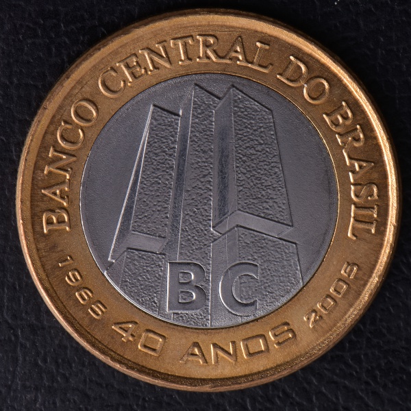 • Moeda do Brasil, Comemorativa ao 40º Aniversário do Banco Central, Valor 1 Real, Data 2005, Cupro Níque e Alpaca, Linda Peça com Brilho de Cunhagem - Flor de Cunho.