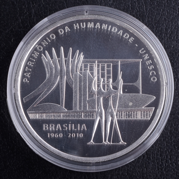 • Moeda do Brasil, República, Série Comemorativa Patrimônio da Humanidade / Unesco - BRASÍLIA, Valor 5 Reais, Data 2010, Prata, Peso 27 g, Diâmetro 40 mm, Acompanha Estojo Original do Banco Central, Proof - Flor de Cunho.