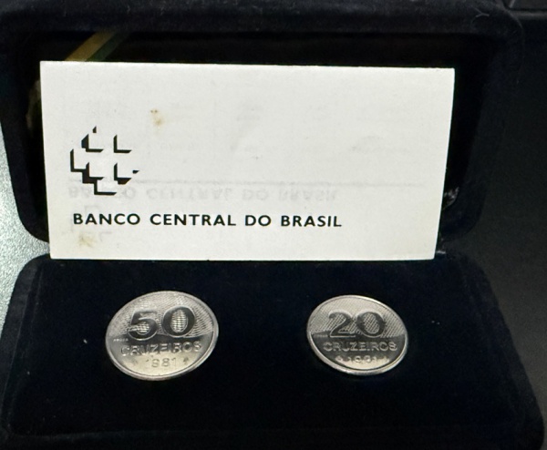 • Moedas Brasileiras. "PROVA", no Estojo Original do Banco Central com Certificado, Valores 20 e 50 Cruzeiros, Ano 1981, Aço Inox, Flor de Cunhos.