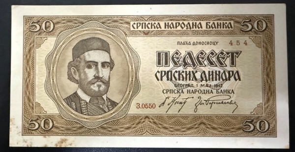 • Cédula Estrangeira, SÉRVIA, Valor 50 Dinars, Data 01/05/1942, Soberba/Flor de Estampa.
