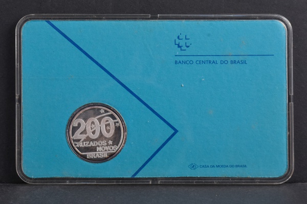 • Moeda Comemorativa do Brasil, Centenário da Proclamação da República, Valor 200 Cruzados Novos, Data 1989, Prata, Peso 13,47 g, Diâmetro 31 mm, com Estojo e sem Certificado, Flor de Cunho.