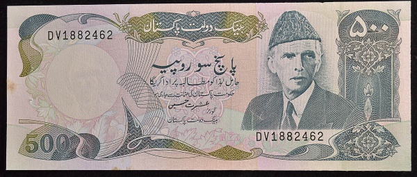 • Cédula Estrangeira, PAQUISTÃO, Valor 500 Rupees, Data 1986, com Manchas - Flor de Estampa.