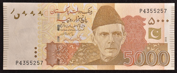 • Rara Cédula Estrangeira, PAQUISTÃO, Valor 5000  Rupees, Data 2013, Flor de Estampa.