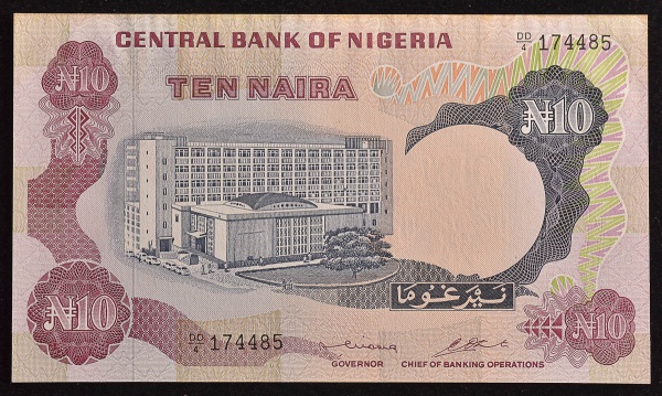 • Rara Cédula Estrangeira, NIGÉRIA, Valor 10 Naira, não datada, com pequenas manchas na extremidade, Flor de Estampa.