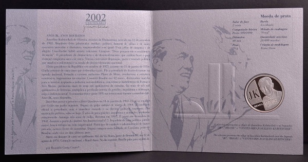 • Moeda Comemorativa, 100 Anos de Juscelino Kubitschek, Valor 2 Reais, Ano 2002, Prata, Peso 27 g, Cartela Original da CMB, Proof - Flor de Cunho.