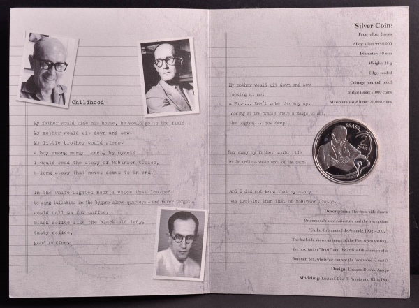 • Moeda Comemorativa, Centenário de Carlos Drumond de Andrade, Valor 2 Reais, Ano 2002, Prata, Peso 27 g, Cartela Original da CMB, Proof - Flor de Cunho.