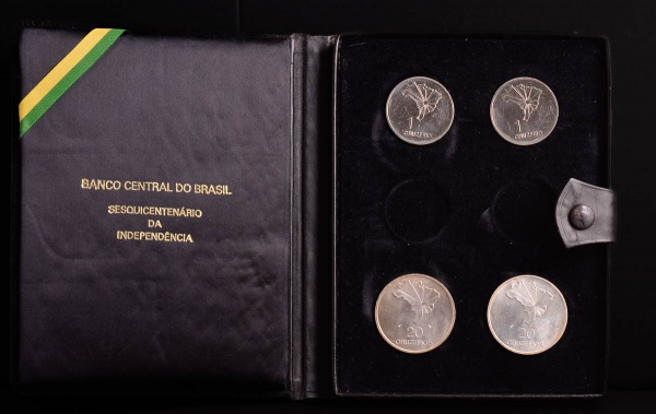 • Moedas Brasileiras, Comemorativas aos 150º Anos da Independência do Brasil, Valores 1 e 20 Cruzeiros, Ano 1972, Níquel e Prata, Acompanha RARO Estojo DUPLO Original, Flor de Cunhos.