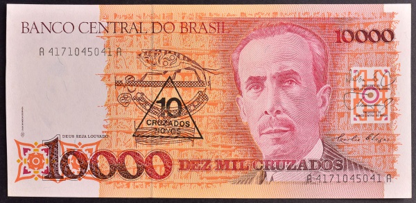 • Cédula Brasileira, Valor 10.000 Cruzados C/carimbo 10 Cruzados Novos, Última Série A4171...A com as Assinaturas Mailson da Nóbrega/Elmo Camões, Flor de Estampa.